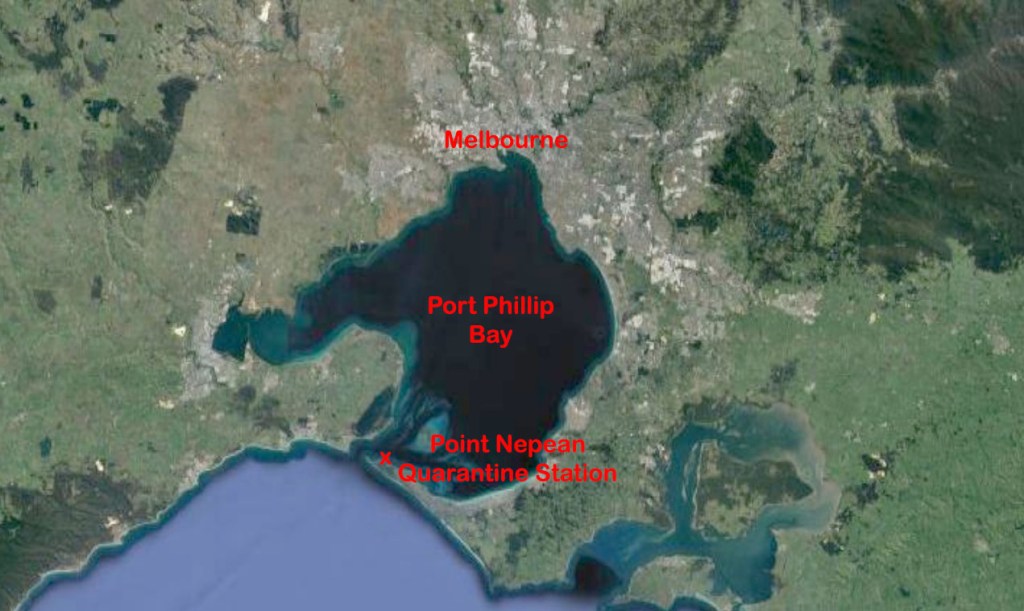 The passengers and crew were quarantined at Point Nepean just inside the Port Phillip Bay heads for the newly formed Victorian Government had already earmarked a parcel of land there to build a quarantine station. Tents were hastily erected using spars and ship’s sails and two nearby houses owned by lime burners were used as makeshift hospitals and staffed with medical men brought out from Melbourne. A ship was also dispatched to the Quarantine Station to serve as a hospital for the more serious cases.
