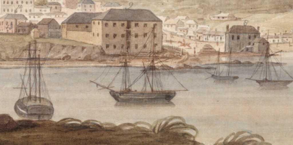 Detail reputedly showing the brig Cyprus (centre) from a panorama of Hobart 1828 – watercolour drawings by Augustus Earle, Courtesy State Library of NSW.