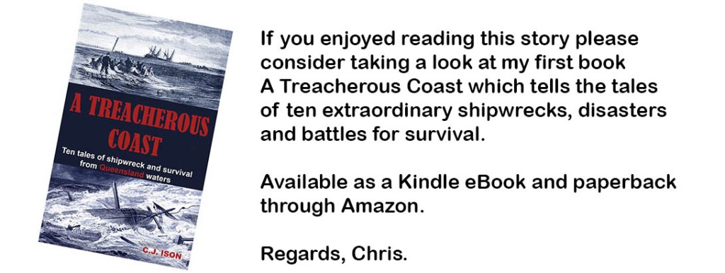 When they climbed back aboard the Errol, they found only one man alive, Able Seaman Jack Lawrence, and he was barely clinging to life. They had survived on a small amount of rain collected in the sails, but it proved almost as salt-laden as seawater. Lawrence described how the others, including the Captain’s wife and children, had passed away one by one from thirst, starvation and exposure. As each person died, their body was pushed over the side to splash in the sea. At least some of those corpses had been savaged by sharks, leaving the grisly spectacle of bones or body parts deposited on the reef at low tide.