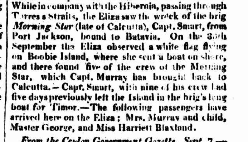 On 30 September, the fully rigged Ship Eliza was sailing through Torres Strait when the lookout spotted a white flag flying from a staff on Booby Island. The captain heaved to and sent a boat across to investigate. When it returned, she carried five marooned sailors from the Morning Star. This is the first recorded instance of shipwrecked sailors seeking refuge on Booby Island. Later, it would be stocked with food and water to assist shipwrecked sailors. A primitive post office with a logbook would also be established, so passing mariners could pass on the location of any uncharted reefs they may have discovered.
