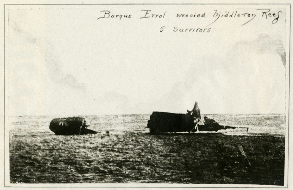 The Errol had left the port of Chimote in Peru on 15 April, with a crew of 17 men and five passengers, comprising the Captain’s wife and four children. The barque was headed to Newcastle to take on a cargo of coal. However, disaster struck around midnight on 18 June when, without warning, the barque slammed into Middleton Reef.