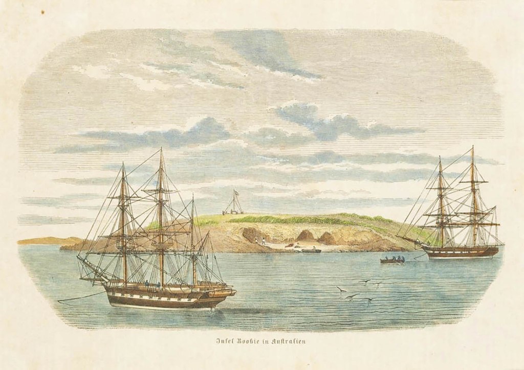 The earliest record of shipwrecked sailors finding refuge on Booby Island dates to 1814. The merchant vessel Morning Star, sailing from Sydney to Batavia, struck a reef and sank in Torres Strait. The crew abandoned the ship and made for nearby Booby Island. They were stranded there for five months, living in one of the island’s caves and surviving on rainwater and the seabirds that resided there. Then a sharp-eyed observer on a passing ship noticed a white flag being vigorously waved by one of the survivors. Five men were rescued. Twenty-two of their shipmates, including the captain, lost their lives.