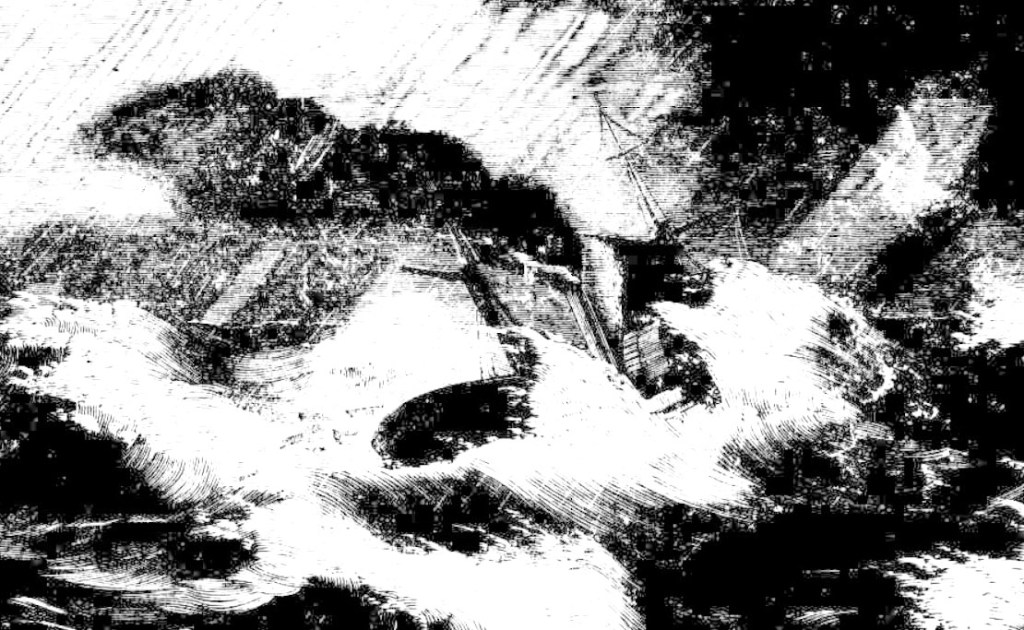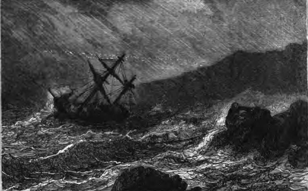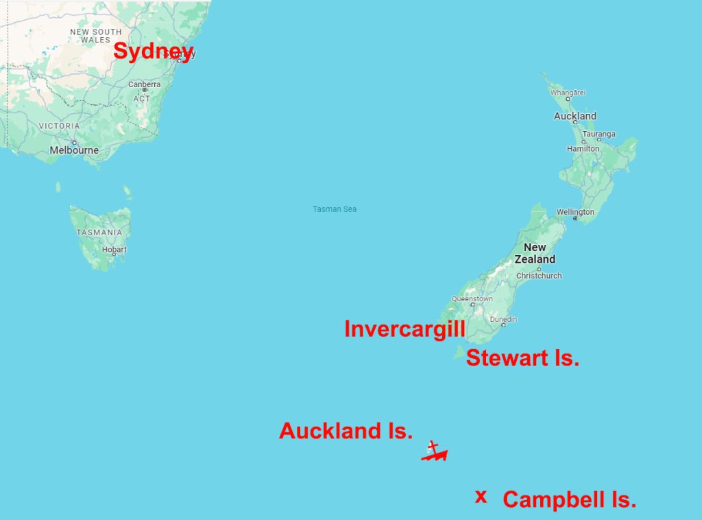 Almost from the outset, they were plagued by foul weather. As they bore southeast in a long, sweeping arc that would take them deep into the South Pacific, they battled strong winds, high seas, rain, sleet, and snow. Then, a week after leaving Melbourne, the lookout sighted the dim outline of land ahead through the pouring rain. Dalgarno took the sighting to be the Auckland Islands, south of New Zealand, at 61 degrees south. He had been unable to take any sightings due to the weather, but had calculated that he was likely approaching their southernmost point. He altered course a few degrees south to clear them with a safe margin. To Dalgarno’s great surprise and alarm, the lookout called land ahead again. Dalgarno’s navigation had been off more than he had anticipated. He realised, too late, that his ship was in mortal danger, for they were being blown towards a lee shore. By now, the sun had set as the storm continued to rage around them. He spied what he thought was a narrow passage separating two islands and decided that this was his best chance to save the ship. He brought the Invercauld around to the north and heaped on as much sail as he dared, hoping to pass unscathed through the channel into calmer waters beyond.