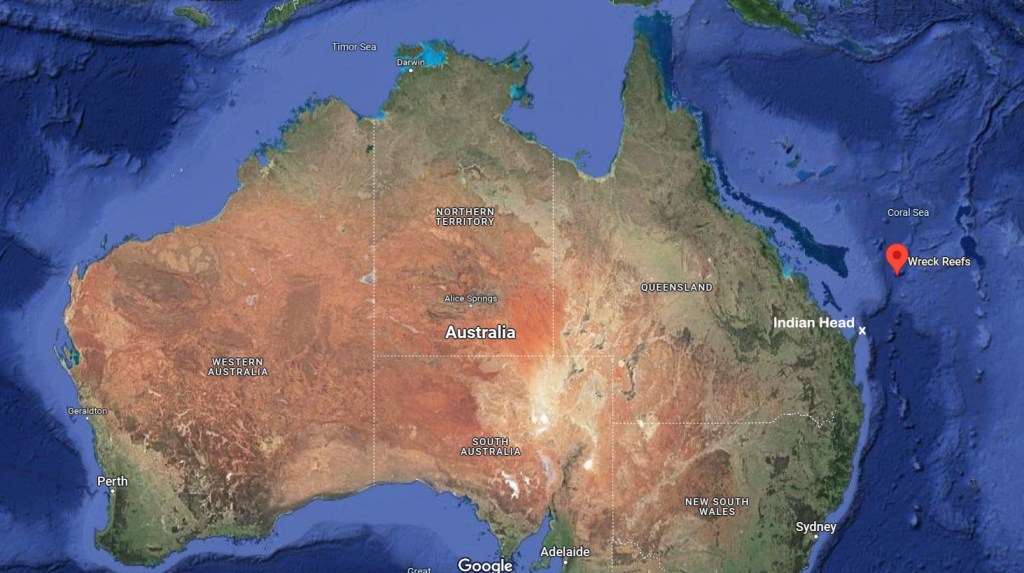 On the afternoon of 17 August, the three ships passed a small island marked on the chart, which confirmed their position about 160nm (300 km) NE of Sandy Cape at the northern end of Fraser Island (K’gari). The chart showed no other obstacles in their path until they were ready to pass through the Great Barrier Reef, much further to the north. As night took hold, they continued bearing NNE under reduced sail, pushed along by a southerly breeze. The Porpoise was out in front with the Cato and Bridgewater off her port and starboard quarters, respectively. Then, around 9.30 pm, the Porpoise’s lookout called “breakers ahead.” The Porpoise tried to veer off but without success, and she struck the uncharted reef. Likewise, the Cato attempted to steer away from the line of white water that indicated danger. However, she had insufficient room to manoeuvre and ran aground about 400m from where the Porpoise struck.