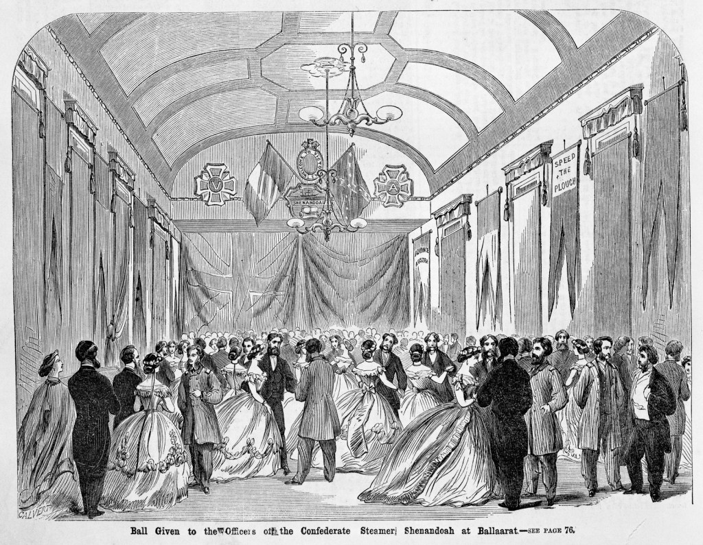 While the government was careful to abide by the requirements of Britain’s proclaimed neutrality, the wider public was far less concerned. The arrival of the Confederate warship caused a sensation. During the first weekend the Shenandoah was in port, more than 12000 people went to take a close look at her. That amounted to 10 per cent of Melbourne’s total population. The visiting Americans were made as welcome as anyone possibly could be. A gala ball was held in their honour in the nearby goldfield town of Ballarat. And, Captain Waddell and his officers were also wined and dined by many of Melbourne’s leading citizens.