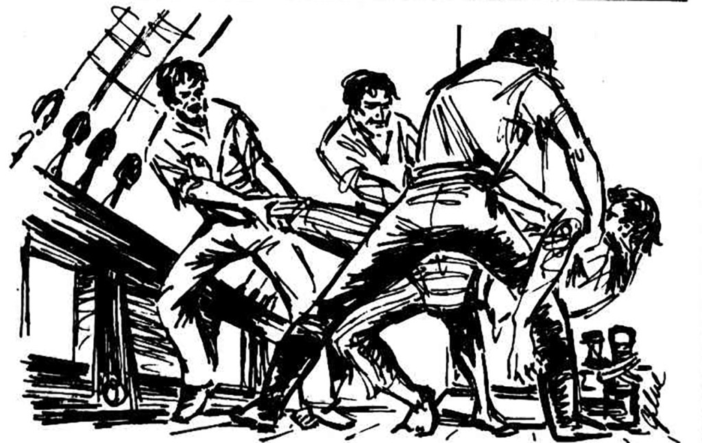 True to their word, the Dyaks returned, only this time there were nearly a dozen of them. It seems that when the visitors arrived, the jolly boat was already in the water, under the control of two seamen, while Brooks, Luttrell and the third Portuguese sailor were still waiting on the beach.